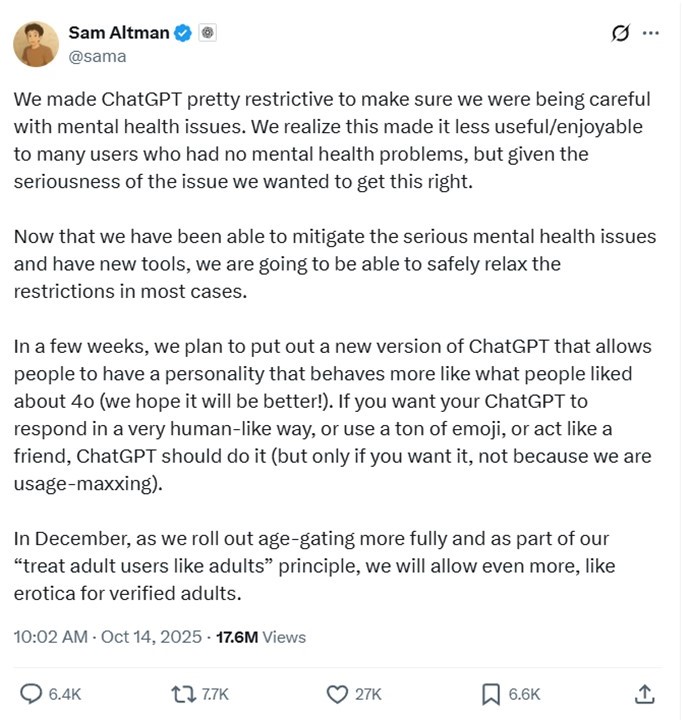 ChatGPT’s descent did not go unnoticed, however. The following day Altman posted an update; “Ok this tweet about upcoming changes to ChatGPT blew up on the erotica point much more than I thought it was going to!” Really? That’s so surprising.