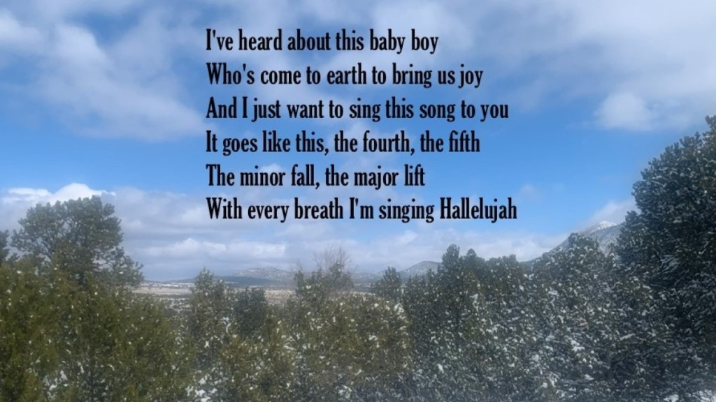 The background music dropped out at the start of this last verse, back to just the piano and vocal, and then began to swell at “My sins would drive the nails in You,” reaching a peak with “Still every breath You drew was Hallelujah!” A chorus joined for the last two bars of “Hallelujah,” punctuated by chimes. It was gorgeous, and being familiar with the original song, wholly unexpected. I’ll admit that upon that first hearing, and just days away from Christmas, I was choked up. As I sat there after the song ended, the first thought that popped into my head was, “Ah, if only I could sing like that I would sing His praises from the rooftops.”